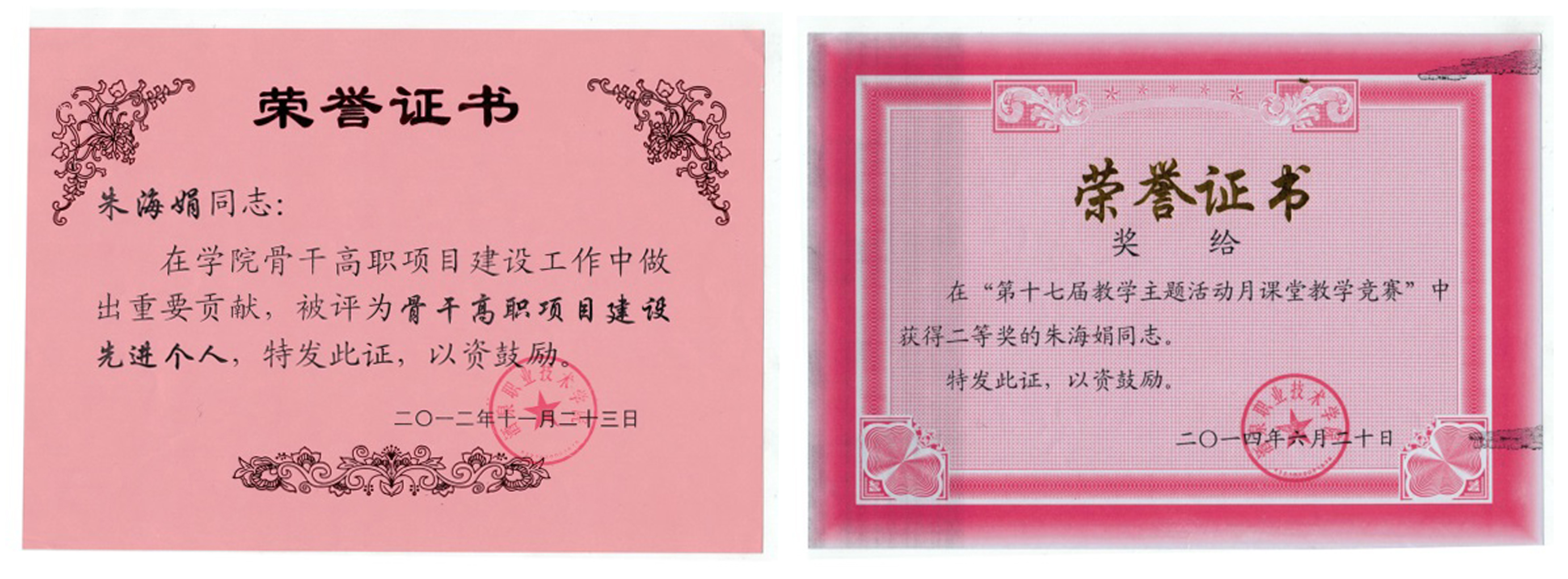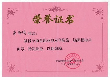 ? ? ? ?近年来,朱海娟老师先后被学校评为“优秀教师”“骨干高职项目建设先进个人”“模范班主任”等;本年度,更是从众多精英中脱颖而出,荣获首届“师德标兵”称号。很多学生——特别是那些事业有成的学生,时隔多年也还念念不忘当年朱老师给予他们的教导与帮助。也许,相比那些“纸上的荣耀”,学生的真情感怀,才是她莫大的欣慰……
