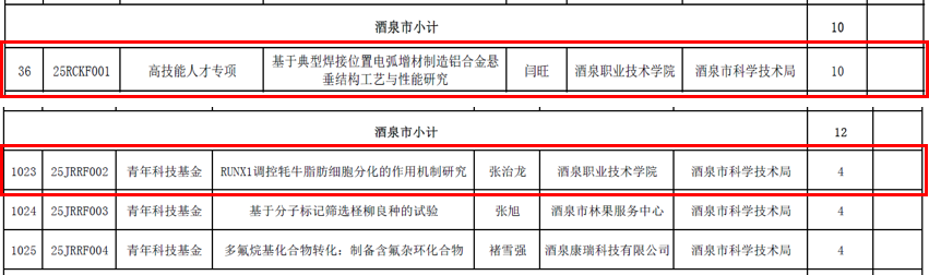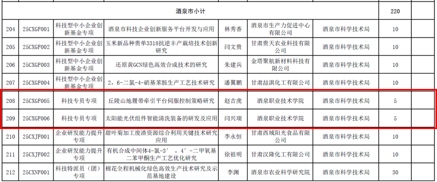 近日,甘肃省科技厅下发2025 年度省级科技计划项目通知,我校共有5项科技计划项目获批立项,立项总金额达34万元,立项数量、项目类别、立项金额均取得新突破。其中,酒泉肉用绵羊高效繁育关键技术研究与集成示范获批科技特派员(团)专项;丘陵山地履带牵引平台伺服控制策略研究和太阳能光伏组件智能清洗装备的研发与应用2个项目获批科技专员专项;基于典型焊接位置电弧增材制造铝合金悬垂结构工艺和性能研究获批高技能人才专项;RUNX1调控牦牛脂肪细胞分化的作用机制研究获批青年科技基金项目。