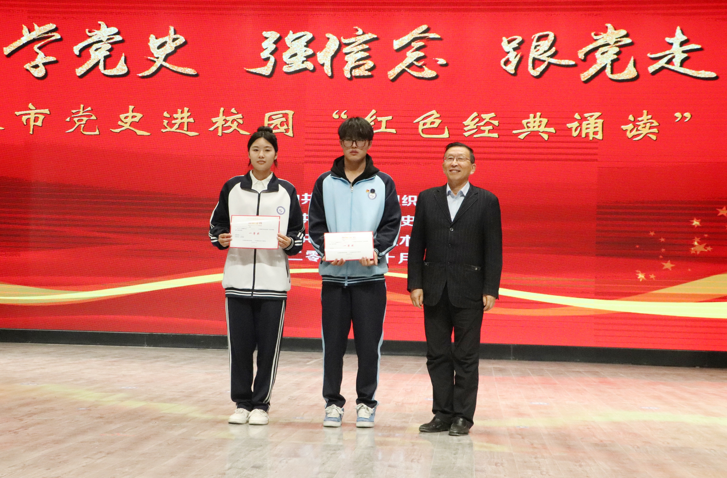 冯德彦讲话,希望同学们要在深学细悟党史中坚定理想信念,要在传承红色基因中汲取精神力量,要在重温党的历程中砥砺坚韧品格,要在致敬革命先辈中激发前行勇气。从现在做起、从自己做起,以“红色经典诵读”活动为契机,学好党的历史,汲取智慧力量,树立远大志向,锤炼过硬本领,努力成长为担当民族复兴大任的时代新人,为加快建设幸福美好新酒泉、实现中华民族伟大复兴的中国梦贡献青春力量!
